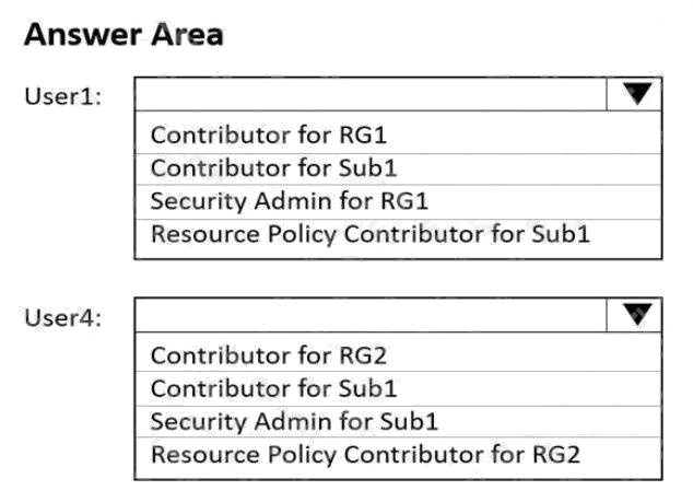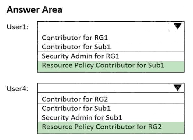 You need to ensure that User1 can create initiative definitions, and User4 can assign initiatives to RG2. The solution must