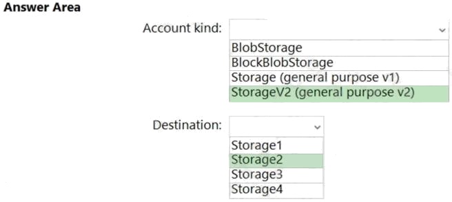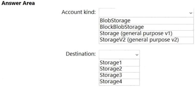 Which type of storage account should you use, and which account should you configure as the destination storage account?