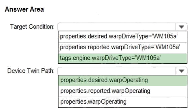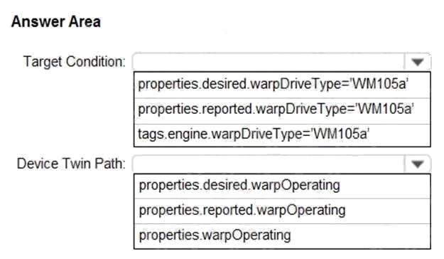 Which target Condition and Device Twin Path should you use? To answer, select the appropriate options in the answer area.