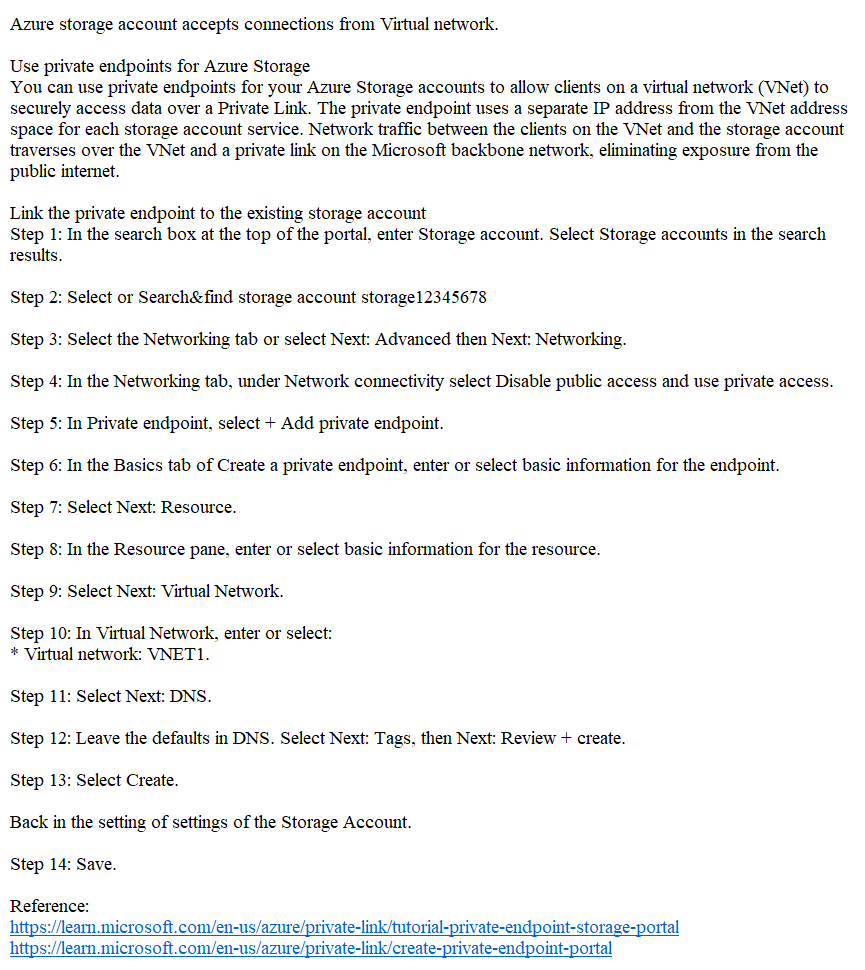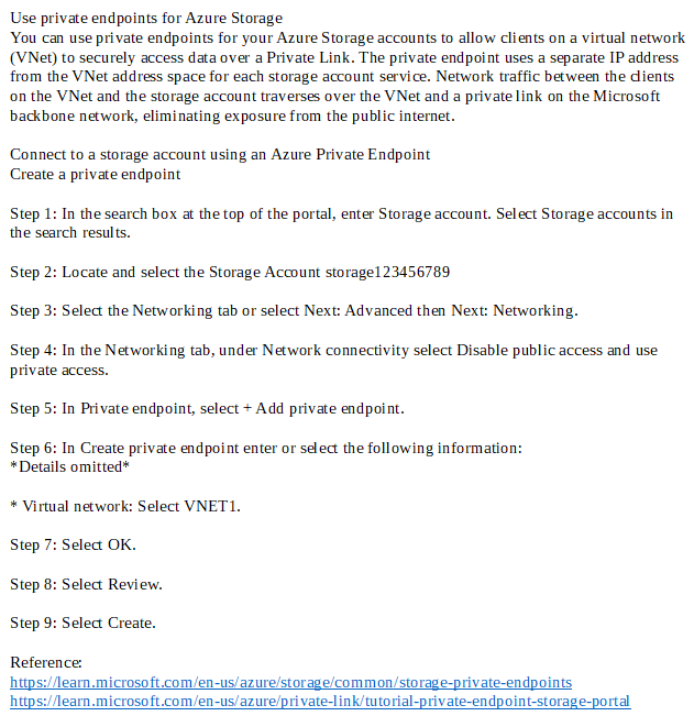 You need to ensure that only hosts on VNET1 can access the storage123456789 storage account. The solution must ensure that access occurs over the Azure backbone network.