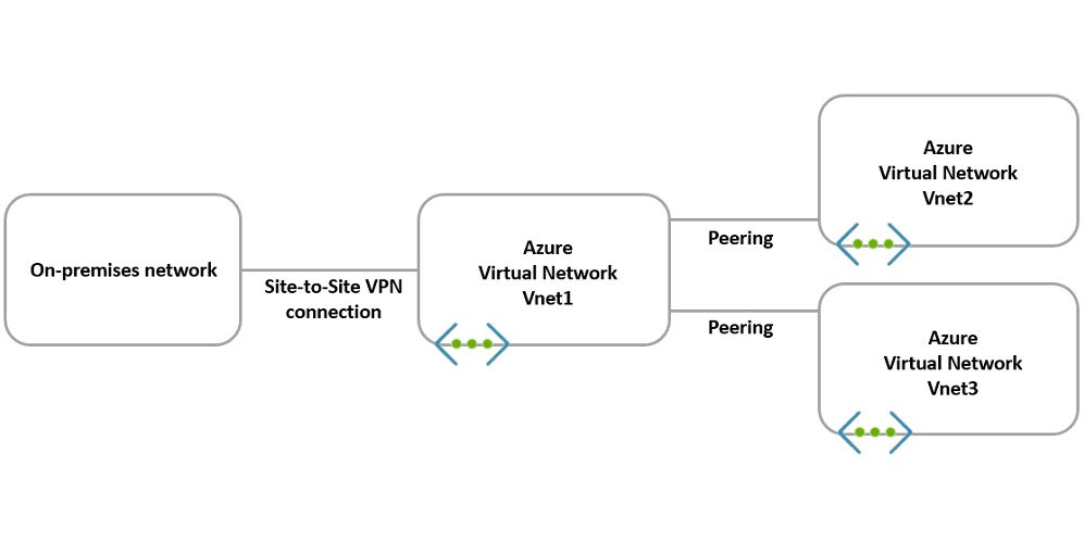 Gateway transit is a peering property that lets one virtual network use the VPN gateway in the peered virtual network for cross-premises or VNet-to-VNet connectivity. The following diagram shows how gateway transit works with virtual network peering.