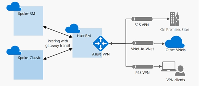 In the diagram, gateway transit allows the peered virtual networks to use the Azure VPN gateway in Hub-RM. Connectivity available on the VPN gateway, including S2S, P2S, and VNet-to-VNet connections, applies to all three virtual networks.