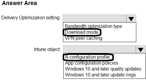 Which Delivery Optimization setting should you configure, and which type of Intune object should you create? To answer, select the appropriate options in the answer area.