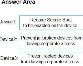 Which compliance policy setting should you configure for each device? To answer, drag the appropriate settings to the correct devices. Each setting may be used once, more than once, or not at all. You may need to drag the split bar between panes or scroll to view content.