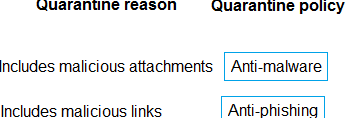 Which quarantine policies should you verify? To answer, drag the appropriate quarantine policies to the correct quarantine reasons. Each quarantine policy may be used once, more than once, or not at all.