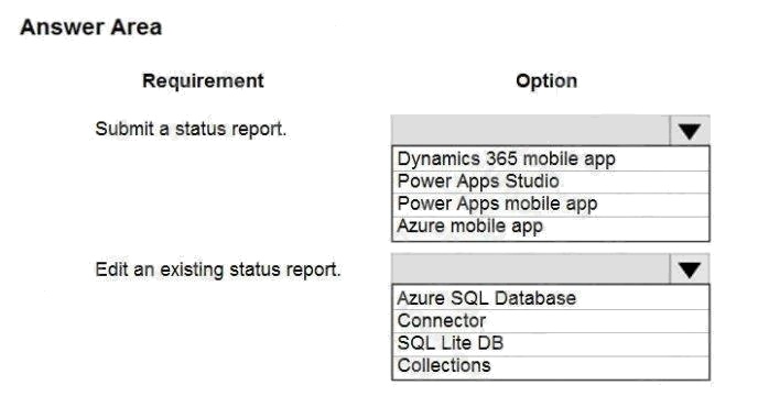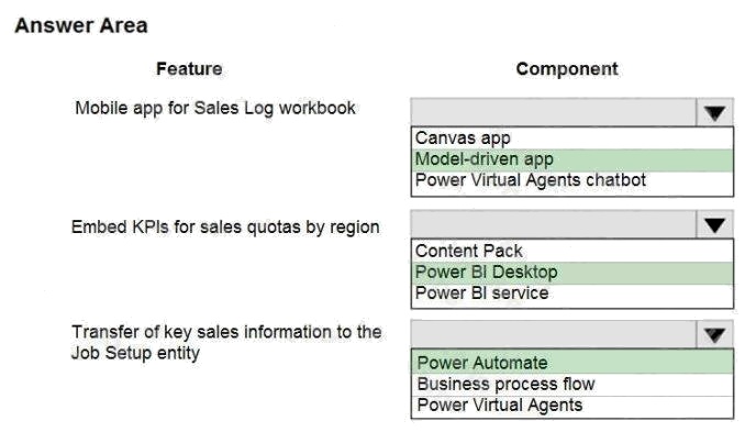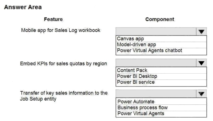 Which Power Platform component should you use for each feature? To answer, select the appropriate options in the answer