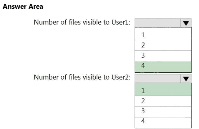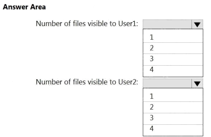 How many files in Site2 will be visible to User1 and User2 after you turn on DLPpolicy1? To answer, select the appropriate