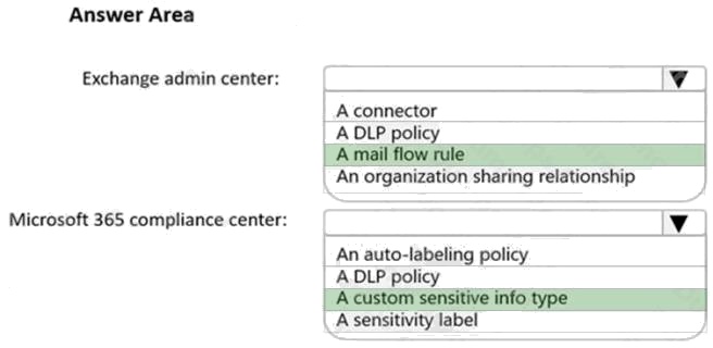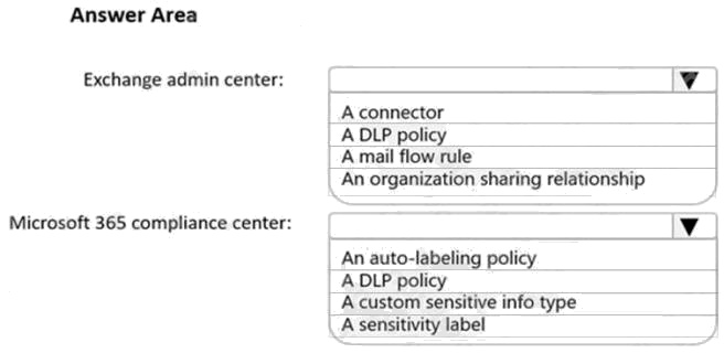 What should you create in the Exchange admin center and the Microsoft 365 compliance center? To answer, select the