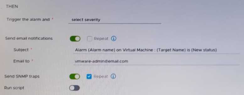 After updating a predefined alarm on VMware vCenter, an administrator enables email notifications