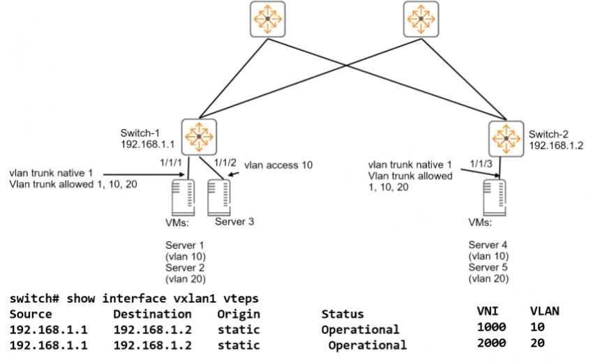 Switch-1 and Switch-2 ate ArubaOS-CX switches that implement VXLAN WITHOUT Ethernet VPN