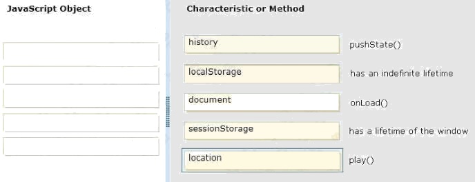 Match the JavaScript objects to the corresponding characteristics or methods. (To answer, drag the appropriate JavaScript
