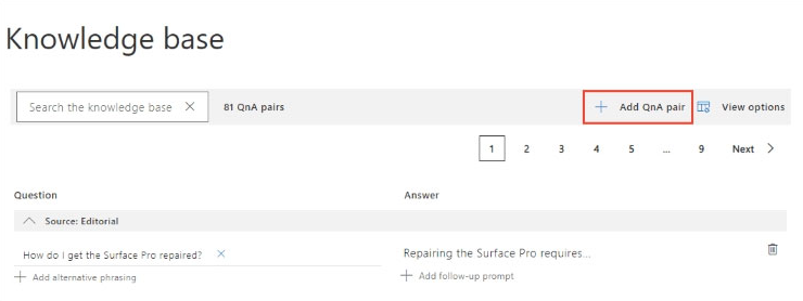 Step 2: On the EDIT page of the knowledge base, select Add QnA pair to add a new QnA pair.