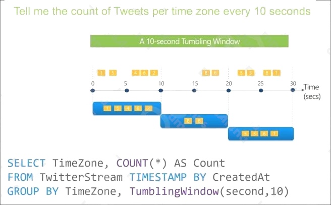 them, such as the example below. The key differentiators of a Tumbling window are that they repeat, do not overlap, and an