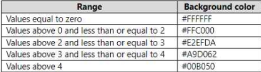 You need to format the visual so that the Revenue column displays a specific background color based on the value range shown in the following table.