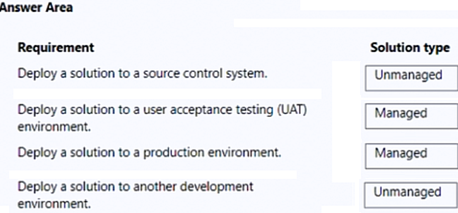 Which type of solutions should you create? To answer, drag the appropriate solution types to the correct requirements. Each solution type may be used once, more than once, or not at all. You may need to drag the split bar between panes or scroll to view content.