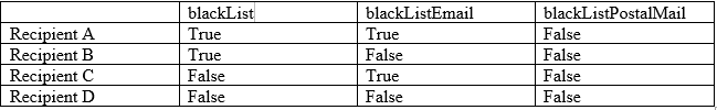An email and direct mail is sent with the below recipient as the target. Their blacklist is shown below. Which recipients receive deliveries and by which channel?