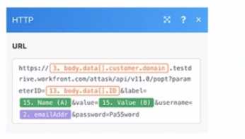 The image provided represents an HTTP module in Workfront Fusion with a URL that dynamically