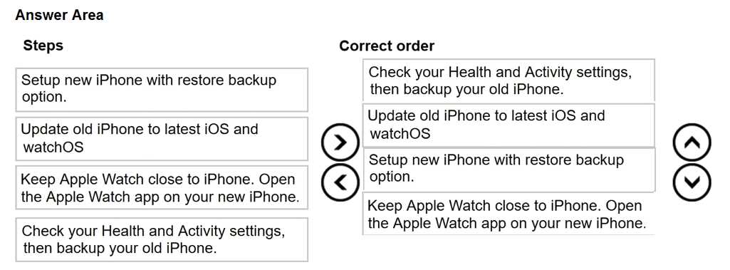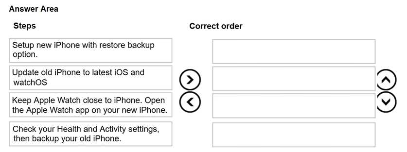 DRAG DROP Jonesy has an Apple Watch and recently purchased an iPhone XR. He would like to use the Apple watch and the data on the old iPhone with the iPhone XR. Place the following steps in the correct order to accomplish his goal. Use the arrow buttons to move the steps from the column on the left to the area on the right and arrange the order.