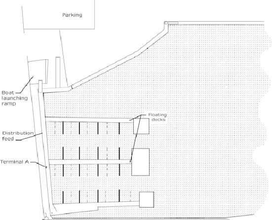 In this future marina layout, what would be the pre-cabling guideline to follow for the terminal A?