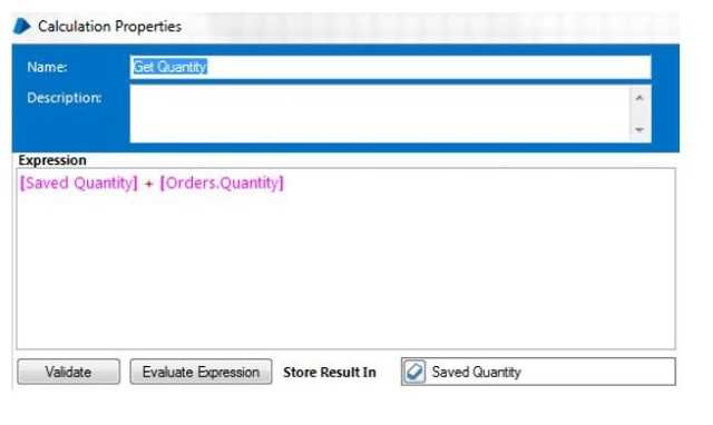 to the Saved Quantity data item using a calculation stage. The initial value of Saved Quantity is 0, and