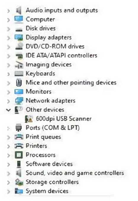 Manager, you see the 600dpi scanner listed under Other devices, as shown in the image.