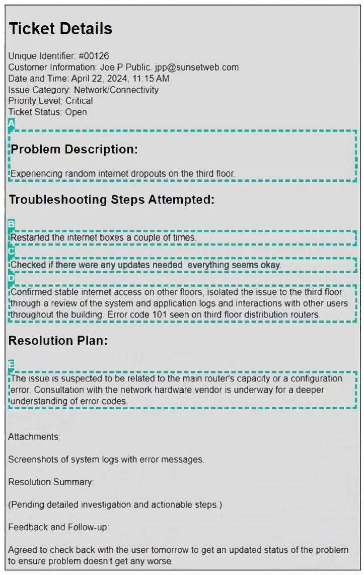 below. Review the trouble ticket below and classify which parts of this ticket follow documentation