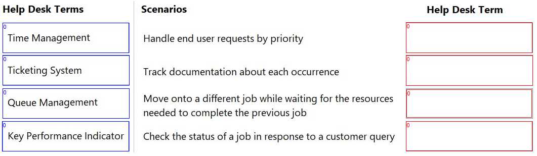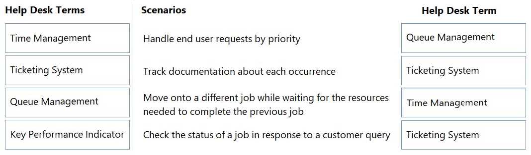 Move each help desk term from the list on the left to the scenario it describes on the right.