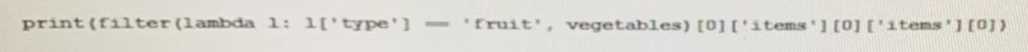 print(filter(lambda l: l['type'] == 'fruit', vegetables)[0]['items'][0]['items'][0])