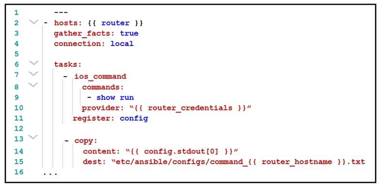 Define the hosts: The playbook targets the {{ router }} group or host.