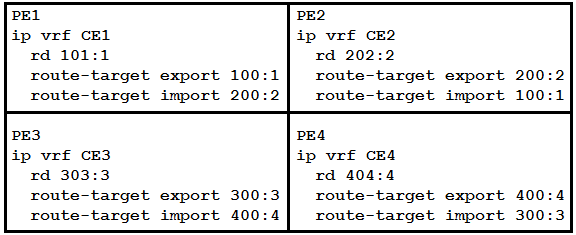 Configure PE1 to import route-targets 300:3 and 400:4.