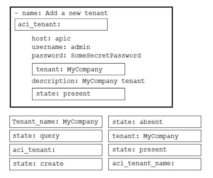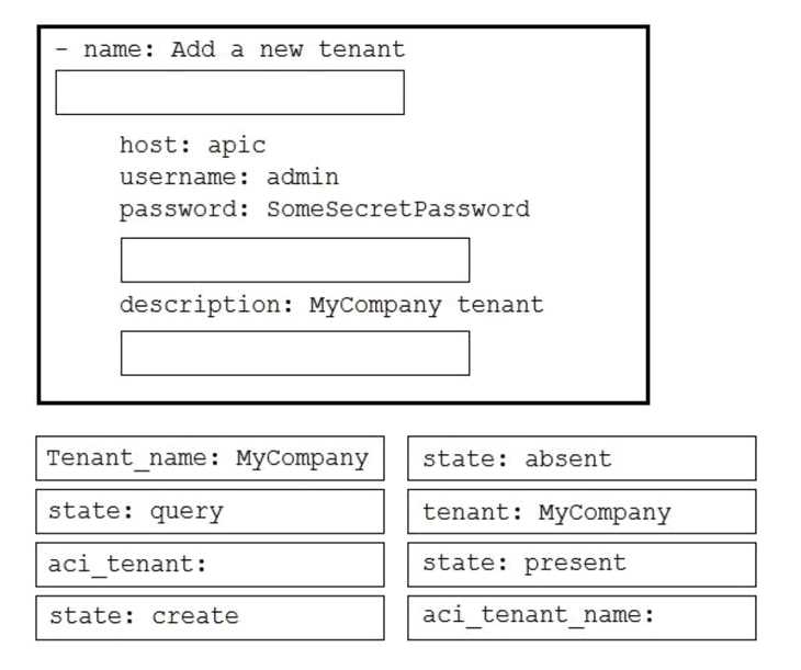 Drag and drop the code to complete an Ansible playbook that creates a new tenant. Not all options