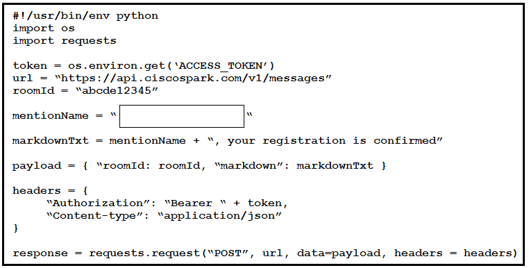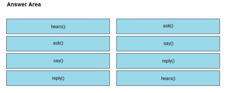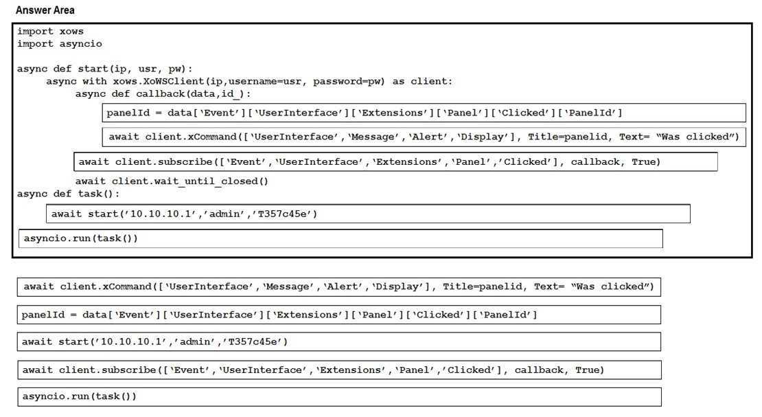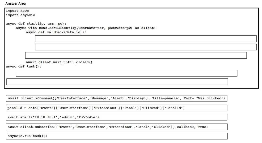 DRAG DROP An administrator is creating a script using the Python xAPI over WebSockets (py xows) library. The goal of the script is to capture an event generated by a UI Extensions action button (former In-Room Control Panel). When the action button is clicked, the script displays an alert that says that the button ID was clicked. Drag and drop the code snippets into the locations to complete the script: