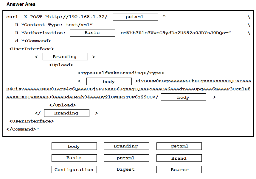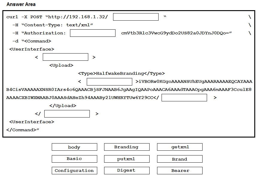 DRAG DROP Drag and drop the code to complete the curl command that creates a halfwake brand logo using the xAPI HTTP API. Not all options are used. Code can be used more than one time.