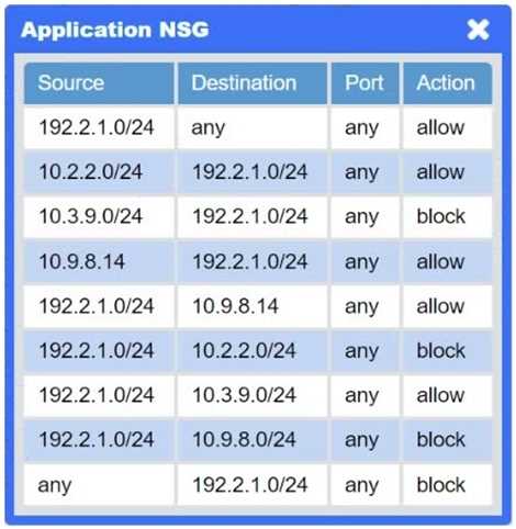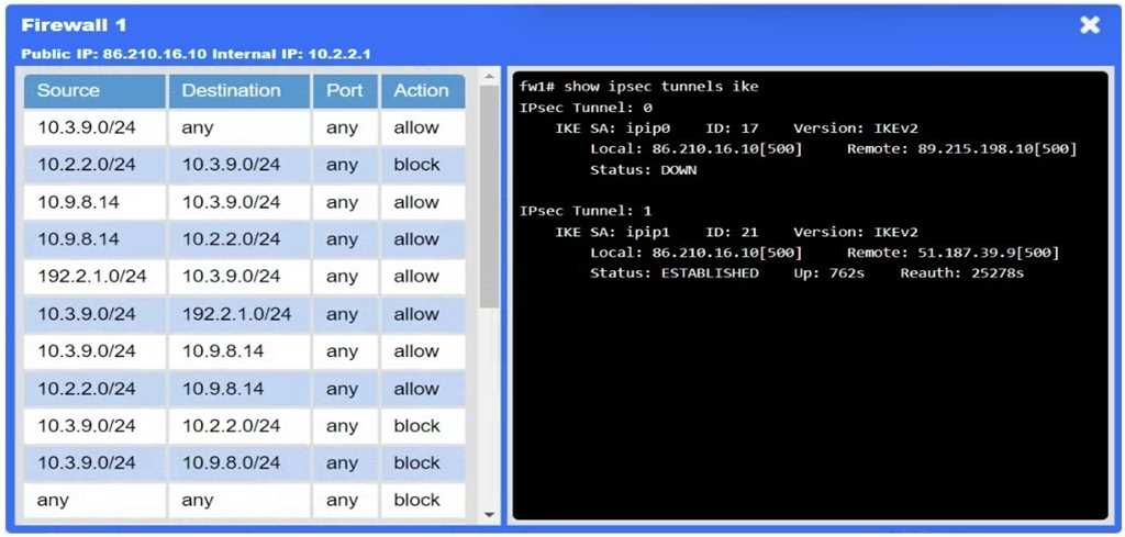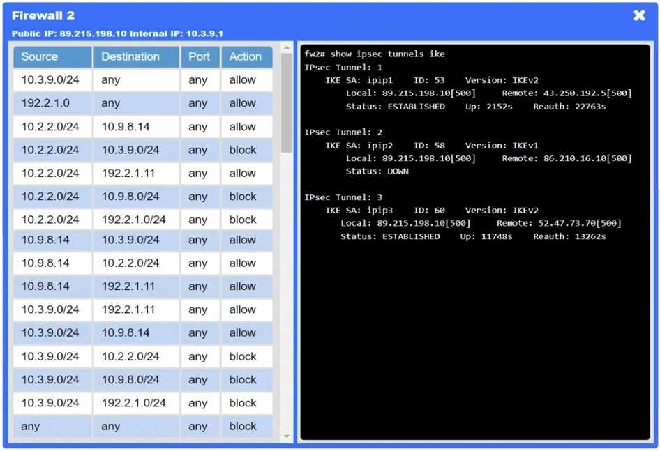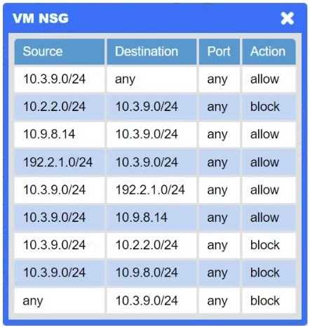 There’s a “block” rule for 10.3.9.0/24 → 192.2.1.0/24, preventing legitimate on-prem clients from