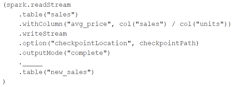 If the data engineer only wants the query to process all of the available data in as many batches as required, which of the following lines of code should the data engineer use to fill in the blank?
