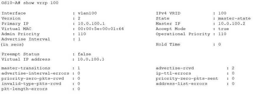 Refer to the exhibit. What is the VRRP state of OS10-A after a router with a default VRRP admin priority with VRID100 comes online?