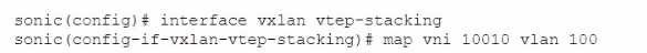 The command interface vxlan vtep-stacking followed by map vni 10010 vlan 100 maps the VLAN