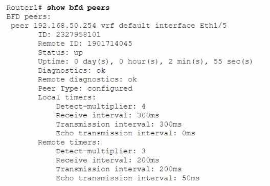 The local timers in the BFD (Bidirectional Forwarding Detection) configuration show a detect