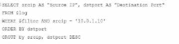 WHERE $filter AND srcip = '10.0.1.10': This line filters logs to only include entries with srcip equal to