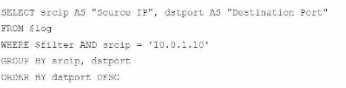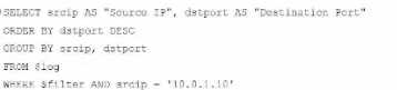 SELECT srcip AS "Source IP", dstport AS "Destination Port": This syntax selects srcip and dstport,