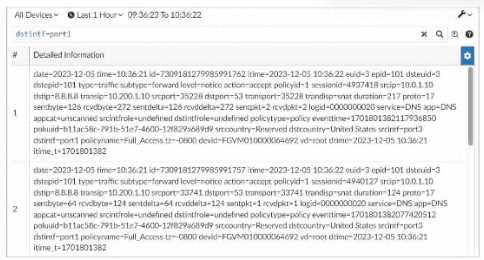 In this exhibit, we observe a search query on the FortiAnalyzer interface displaying log data with