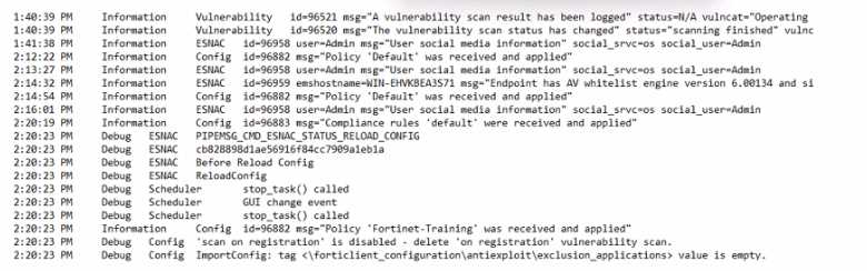 FortiClient EMS policy configuration and log analysis documentation from the study guides.
