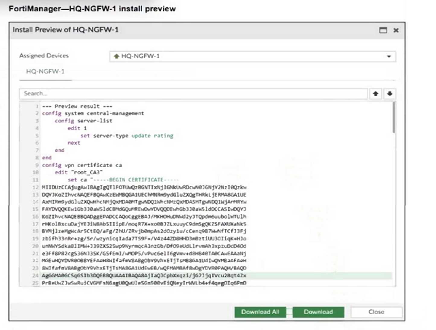 An administrator assigned a new policy package to FortiGate HQ-NGFW-1. In the installation preview,