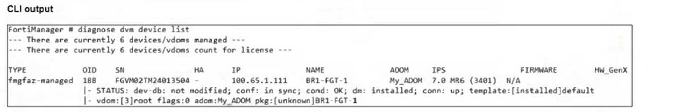 The CLI output shows the status "dev-db: not modified; conf: in sync; cond: OK; dm: installed," but