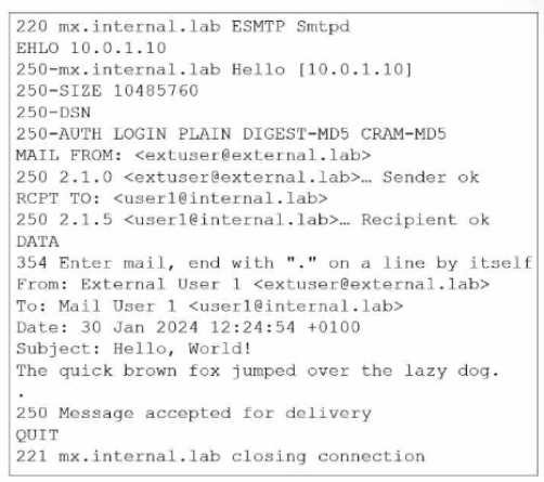 Refer to the exhibit, which shows the output of an email transmission using a telnet session. What are two correct observations about this SMTP session? (Choose two.)