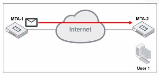 Refer to the exhibit, which shows a topology diagram of two MTAs. MTA-1 is delivering an email intended for User 1 to MTA-2. User 1 uses Outlook as an email client. Which two statements about protocol usage between these devices are correct? (Choose two.)