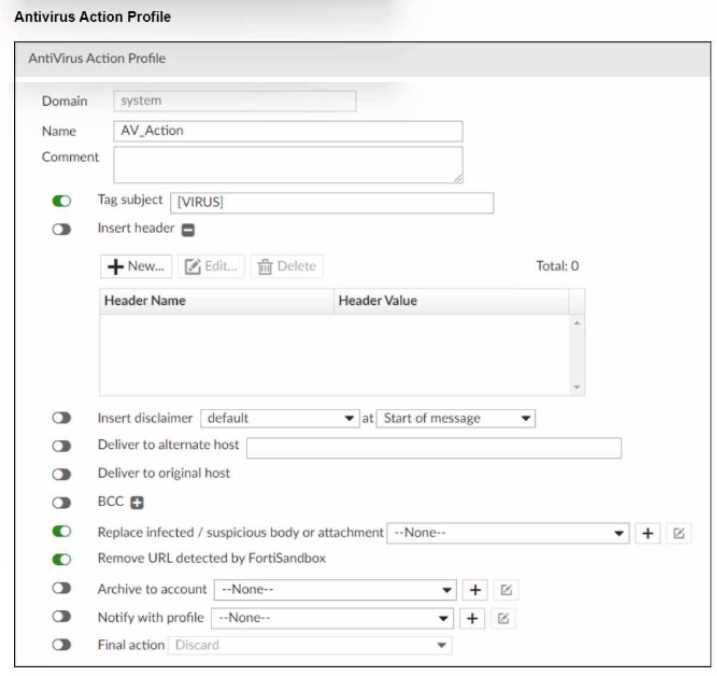 Refer to the exhibit. Refer to the exhibit, which shows an antivirus action profile. What are two expected outcomes if FortiMail applies this antivirus action profile to an email? (Choose two.)