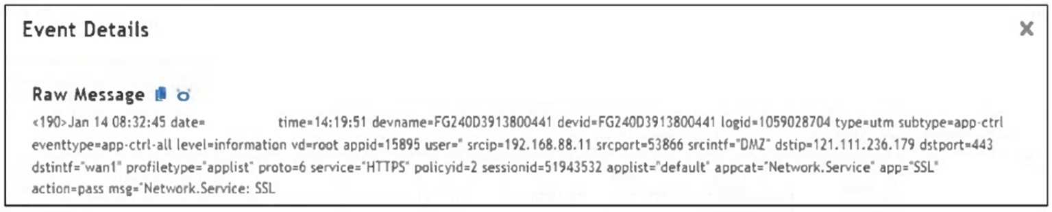 raw log. In this event, app="SSL", so "SSL" is the expected application name parsed by FortiSIEM.