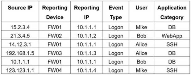 (FW01, 10.1.1.1, DB), (FW02, 10.1.1.2, WebApp), (FW01, 10.1.1.1, SSH), (FW03, 10.1.1.3, DB), and