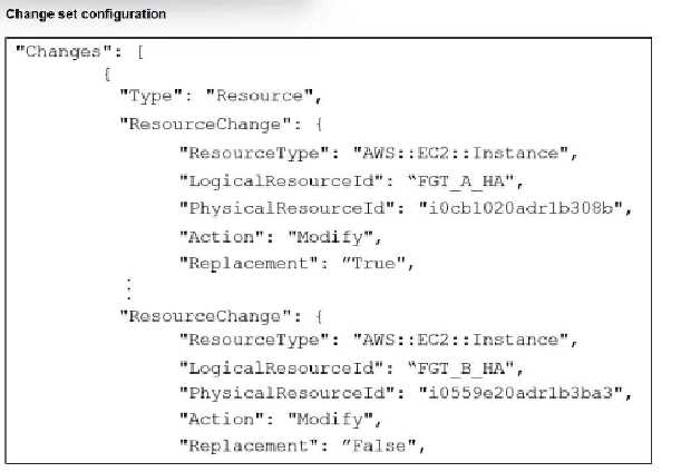 Refer to the exhibit. Refer to the exhibit. You are managing an active-passive FortiGate HA cluster in AWS that was deployed using CloudFormation. You have created a change set to examine the effects of some proposed changes to the current infrastructure. The exhibit shows some sections of the change set. What will happen if you apply these changes?